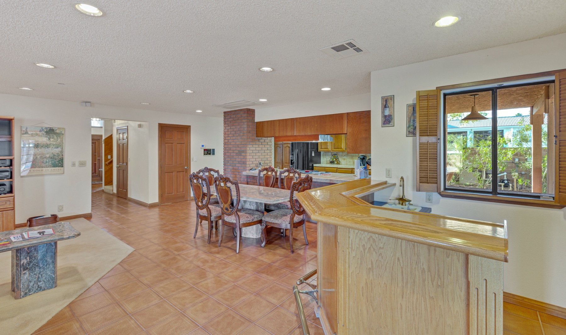 Window that looks out into your backyard and to the right looks into your great room, wet bar, and fireplace area.