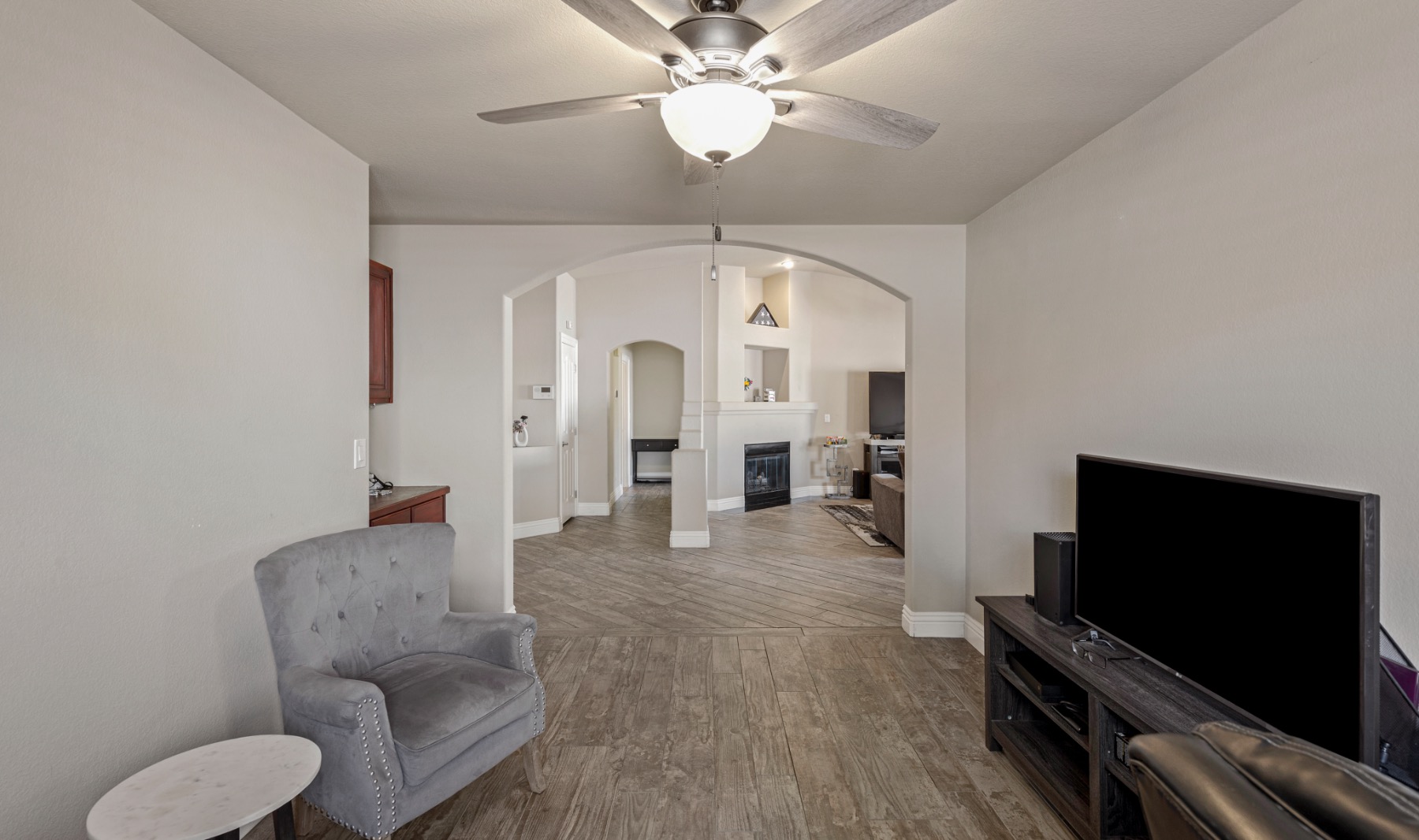 Enjoy a Den with Ceiling Fan and Built in Cabinets for Storage