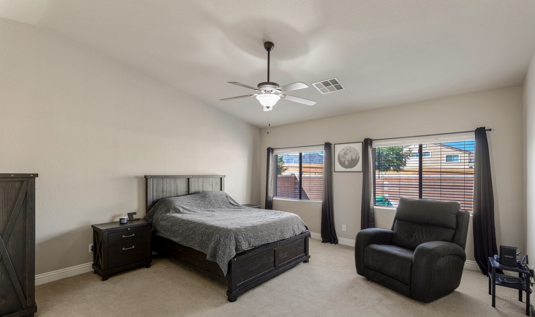 Enjoy the Large Primary Bedroom with Vaulted Ceilings and a Ceiling Fan