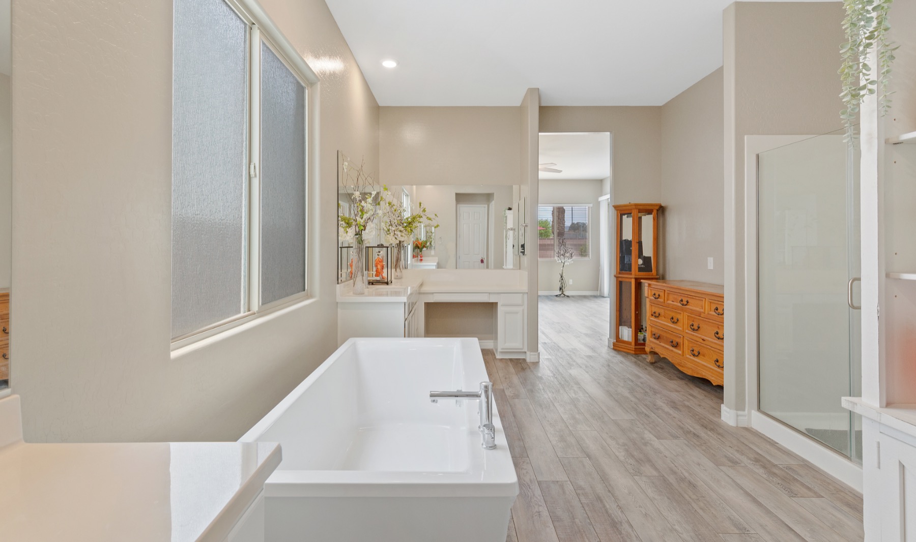 Separate Shower, Large Tub, Dual Sinks (1 with make-up counter), and a large walk in closet!