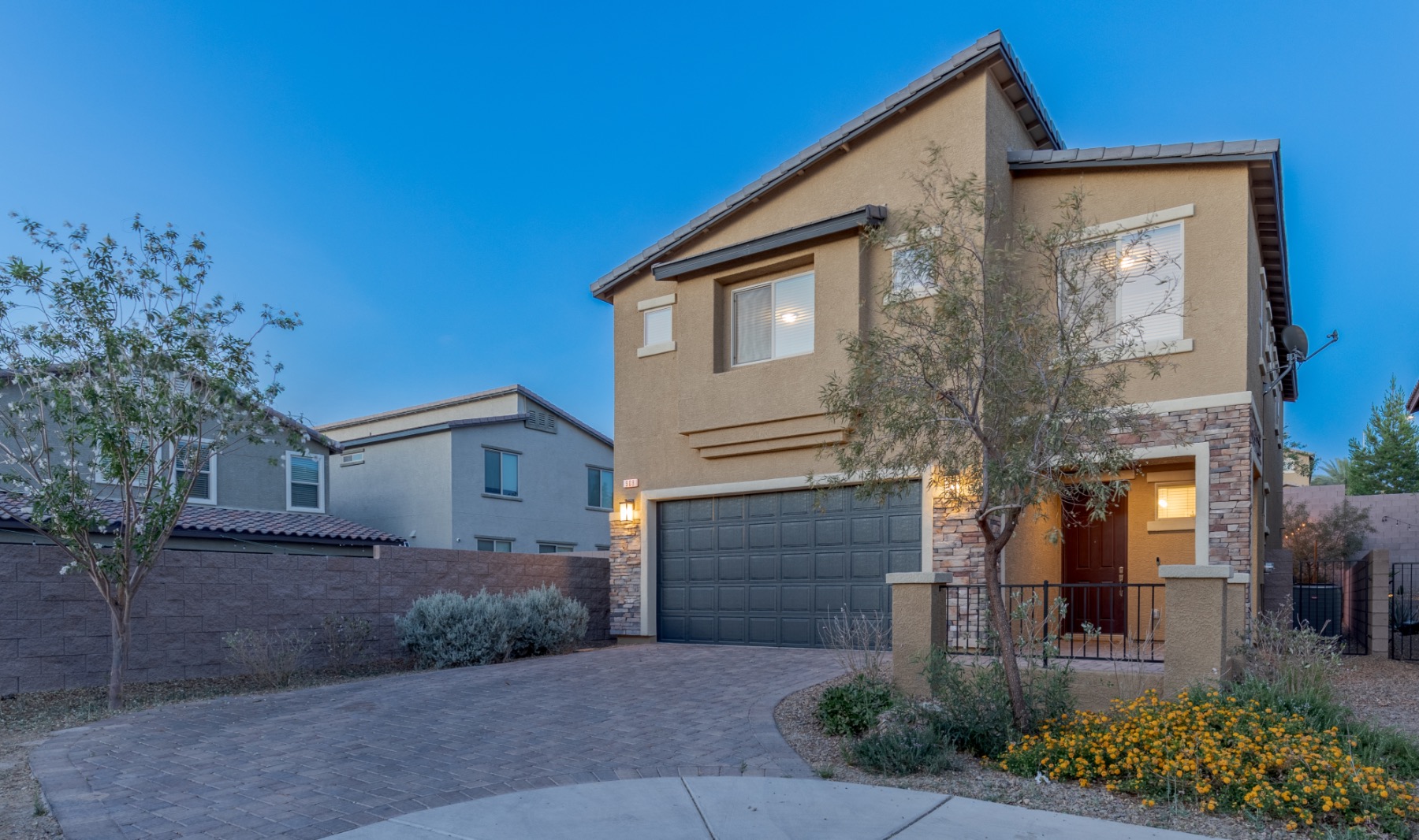 Welcome Home! This move-in-ready beauty is situated in the gorgeous gated community of Coronado Falls on an awesome cul-de-sac corner lot and features a contemporary exterior elevation with stones, extended paver driveway, front courtyard, and covered entry. Enjoy 12x36 tile throughout the whole downstairs and upstairs in all the wet areas. The backyard is tastefully done with low maintenance landscaping, pavers, turf, and gorgeous outdoor lighting. The property features 4 bedrooms, 2.5 baths, and an incredible large loft upstairs. Other features include granite countertops throughout, pre wired for surround sound in the living room, recessed can lighting throughout, soft close cabinets, stainless steel appliances, a large laundry room with cabinets, convenient access to groceries, shopping, dining, highway access (215 and the 15), St. Rose Pkwy, and within walking distance to Coronado High School.
